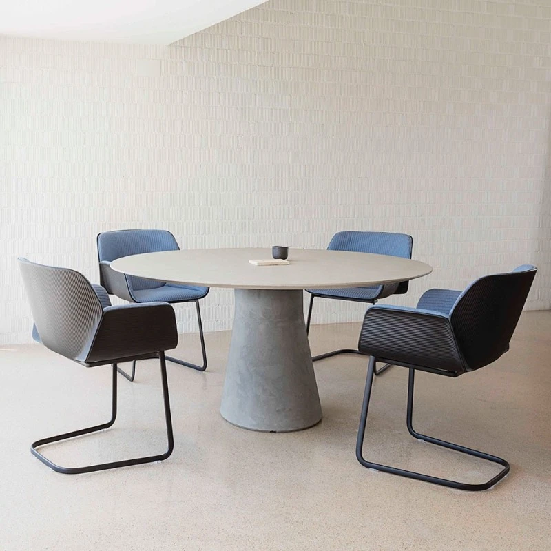 Sillón con carcasa de termopolímero Eco disponible en diferentes colores o termopolímero Pure Eco (100% reciclado) disponible en color arena y base cantiléver de pletina ovalada de acero en acabado cromo brillo, blanco o negro. Opción de asiento plafonado o asiento y respaldo plafonado.