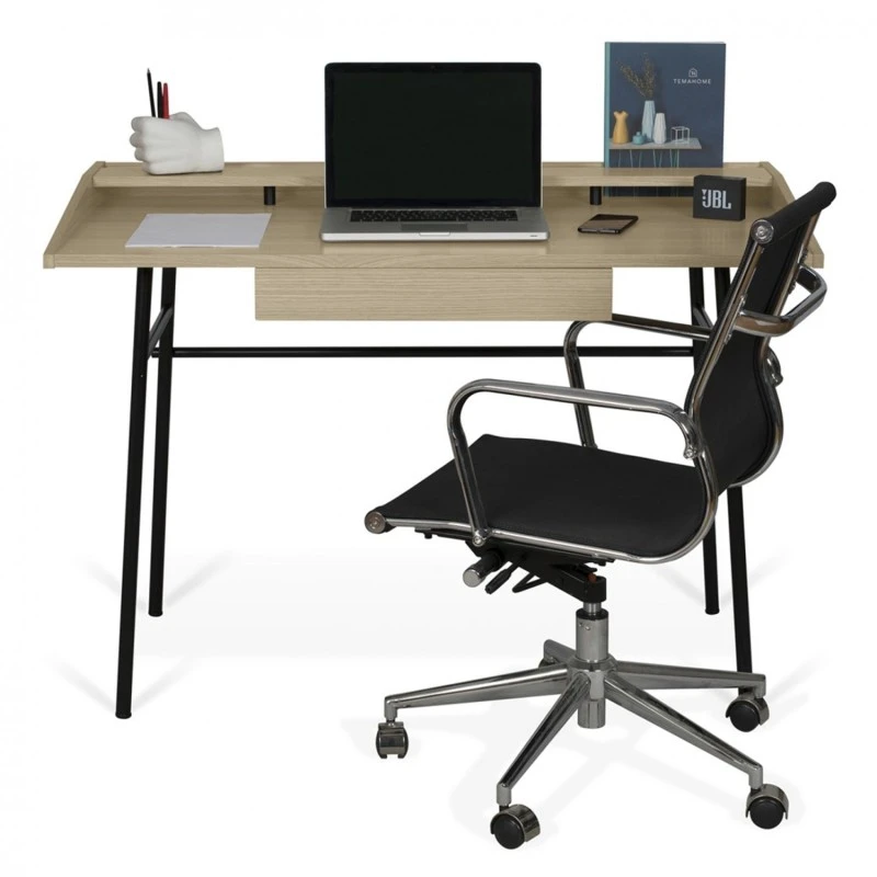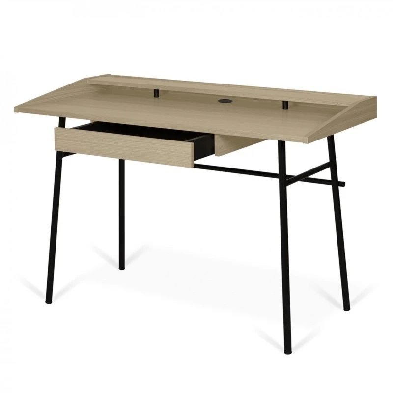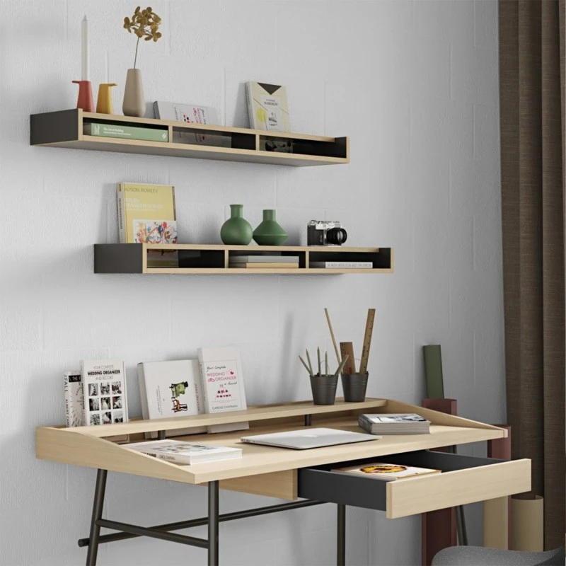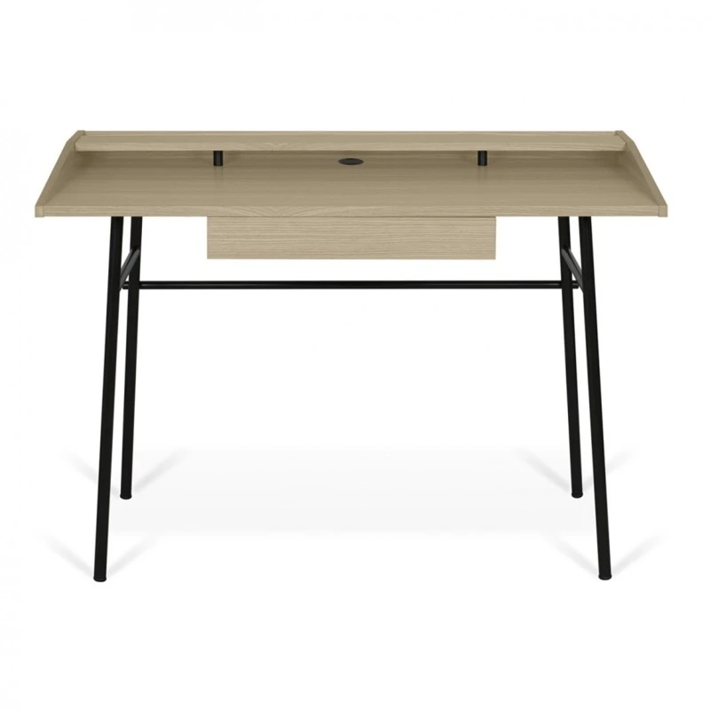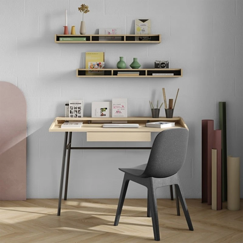 Ply es un escritorio moderno y funcional con tres espacios de almacenamiento pequeños que brindan almacenamiento horizontal, un estante superior y un espacio abierto en la parte posterior para una organización vertical de las cosas. El cajón central debajo de la parte superior de trabajo ofrece un ea de almacenamiento oculta.