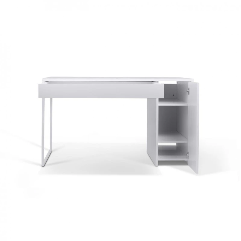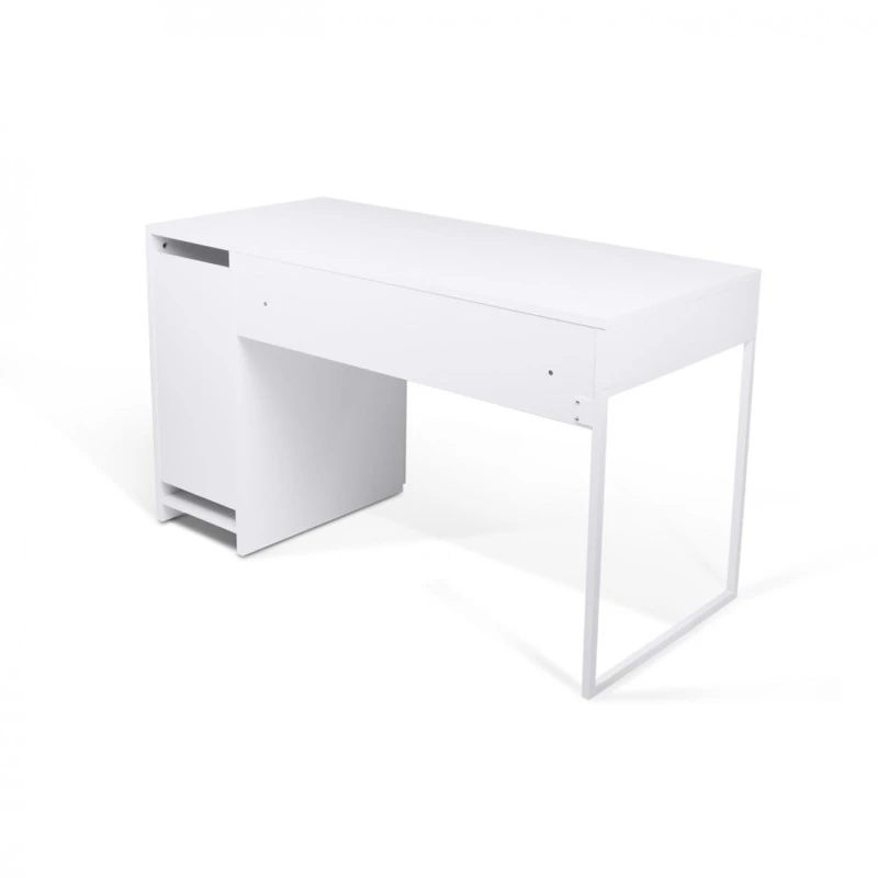 Un escritorio de oficina en casa con cajón y armario lateral con estante.