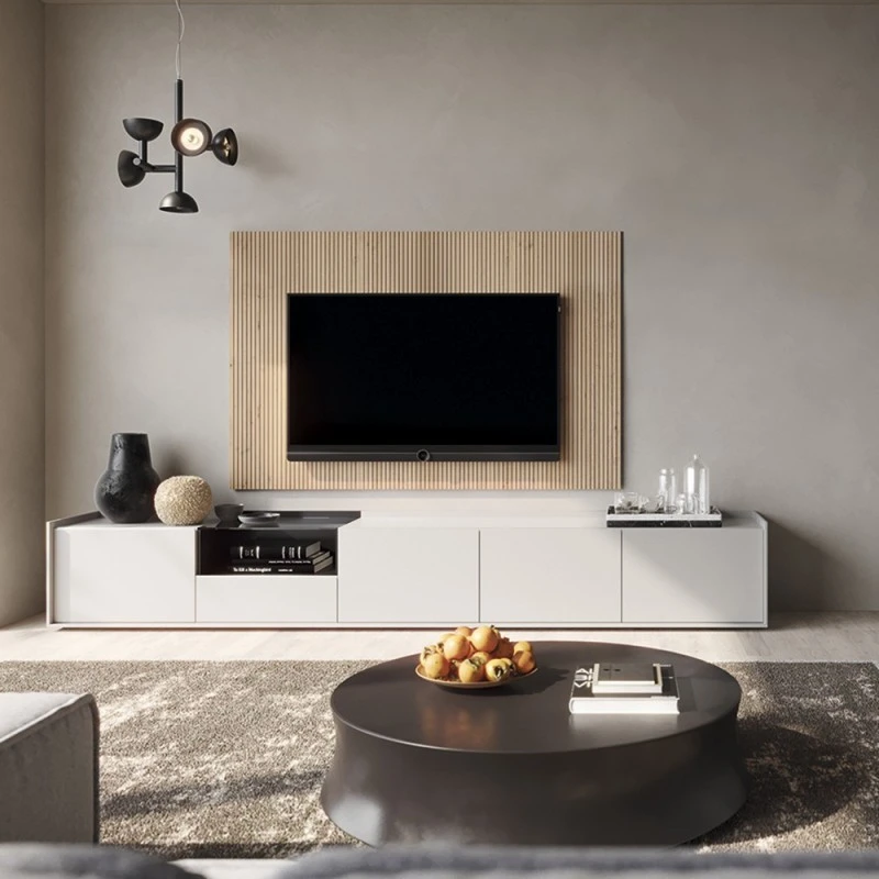 Composición modular moderna de salón REPLAY 06. Composición con módulo bajo con bandeja de cristal y panel en pared de madera ranurada, adaptado para colocar una televisión y con variedad de medidas.