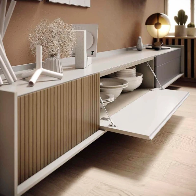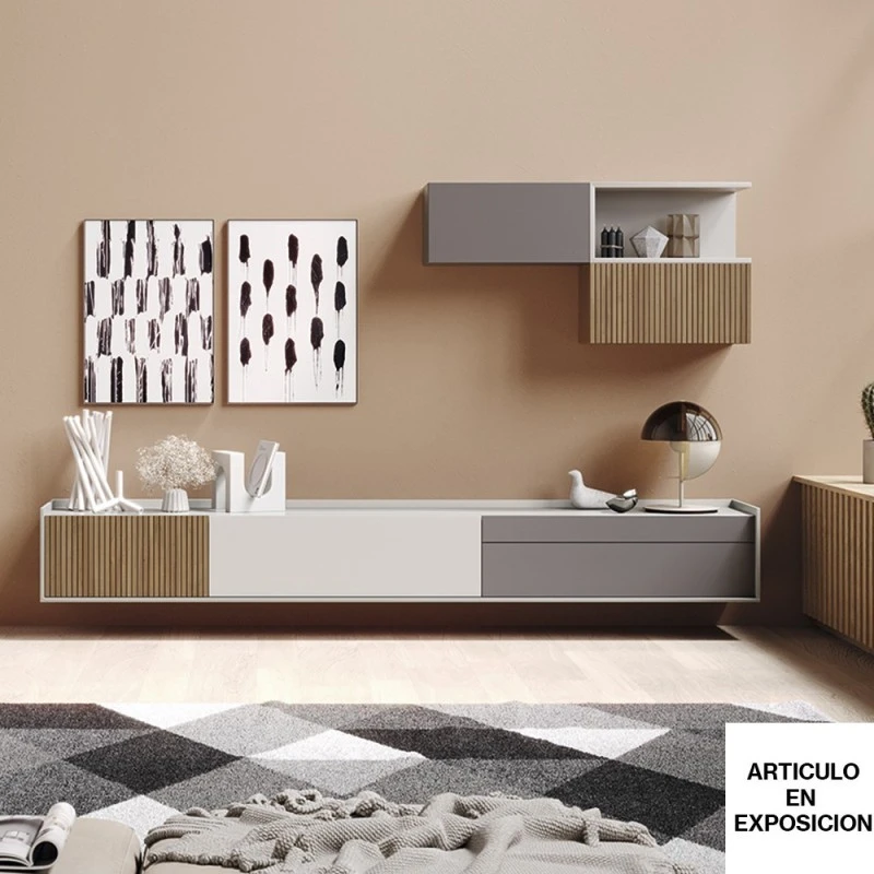 Composición modular moderna de salón REPLAY 07. Los tonos naturales predominan en esta composición. El Piedra Mate combinado con pequeños toques