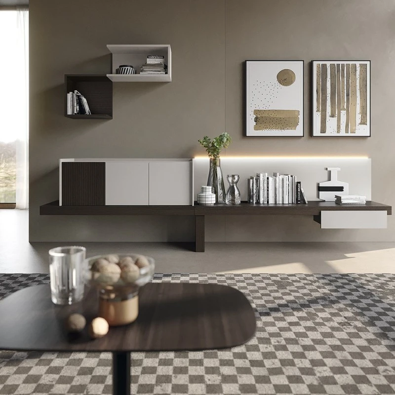 Composición modular moderna de salón REPLAY 08. Composición con paneles con luz led superior, módulo cajón suspendido y gran capacidad. Bancadas suspendidas con gran capacidad de carga, donde podemos apoyar módulos bajos.