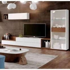 Composición de salón de líneas rectas y modernas, módulos altos y bajos combinándose entre sí, una linea atemporal de diseño.