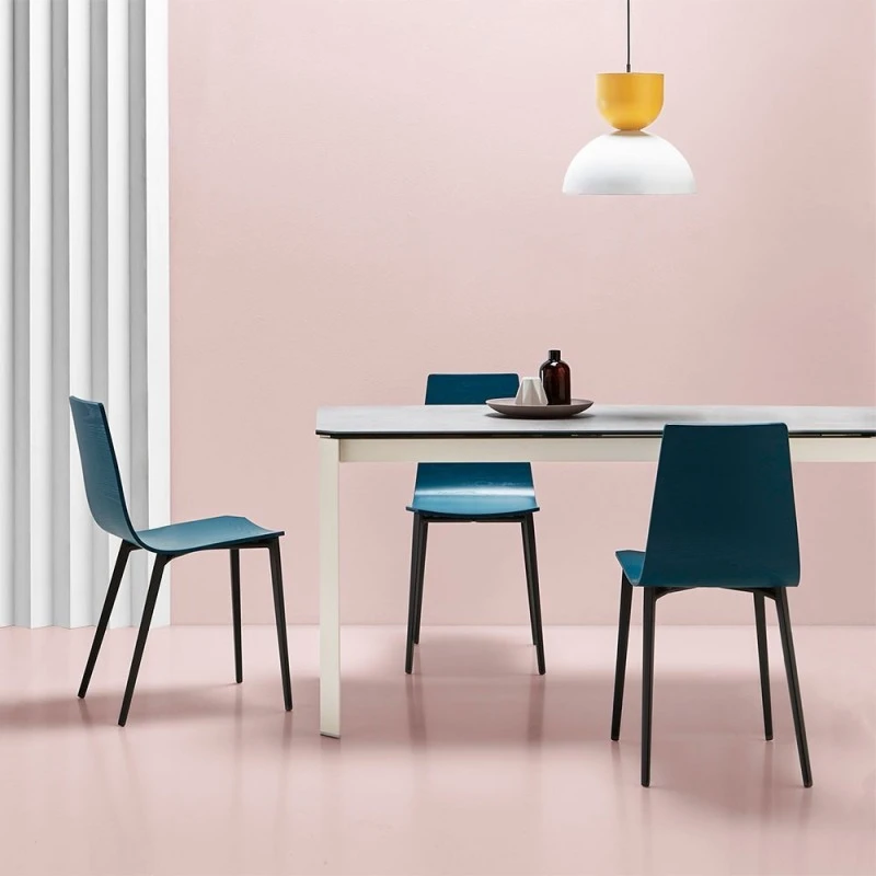 La colección Salt incluye una mesa fija y otra extensible con dos alturas posibles y una mesa auxiliar de H40. Los modelos de esta colección ofrecen dimensiones muy contenidas para poder tener cabida en espacios reducidos, siendo este su principal fuerte. La tapa es de porcelánico técnico laminado y se adapta perfectamente a las patas triangulares gracias a la forma que se le ha dado a sus cantos. Además de las mesas, la colección Salt incluye una silla y un taburete con diferentes asientos que le otorgan una versatilidad total a la colección. Una solución de madera y otras dos de tapizado, junto a su estructura metálica y de forma triangular.