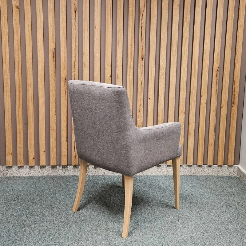 Silla de comedor tela gris con reposabrazos Bali. Estructura en madera de haya.
