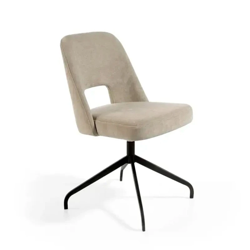 Silla de comedor tapizada giratoria Emma D con patas metalicas. Se puede lacar en cualquier color que se ofrece en el muestrario del fabricante. Tapizado en tela Tucan de fácil limpieza.