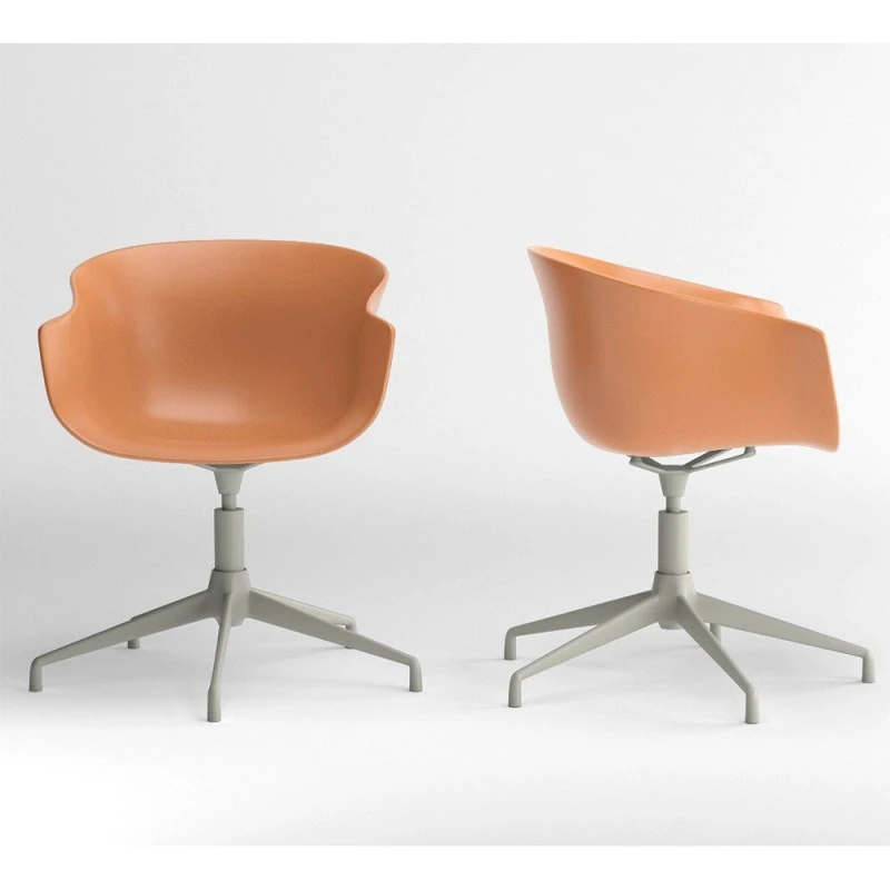 De proporciones generosas y líneas envolventes, una pieza polivalente de aspecto noble y cálido. La silla Bai con su estructura de acero con patas entrecruzadas que sostienen una carcasa de formas suaves y orgánicas en polipropileno terracota.