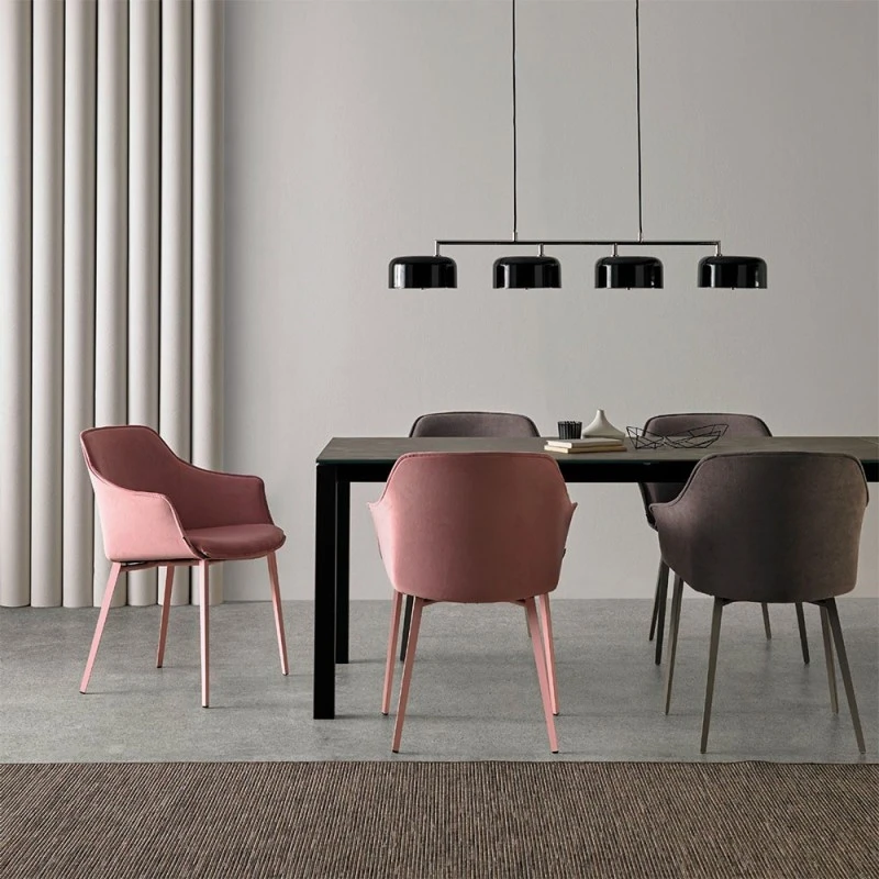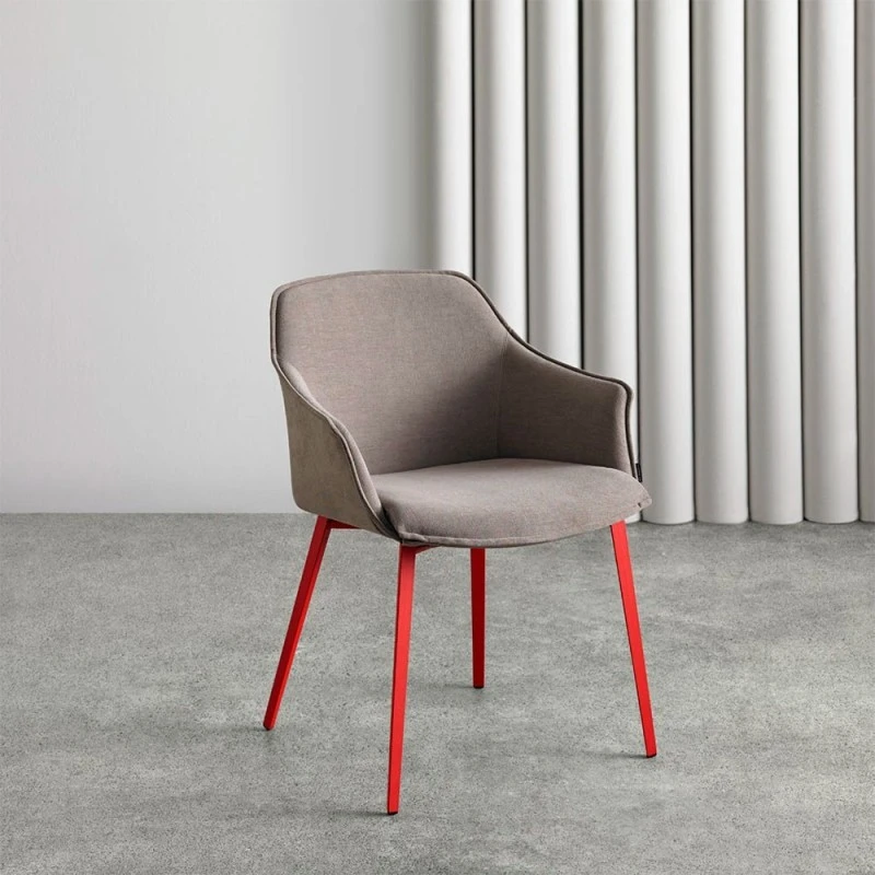 Silla de comedor Kedua con brazos y patas metálicas. Diseñada por Santiago Sevillano.