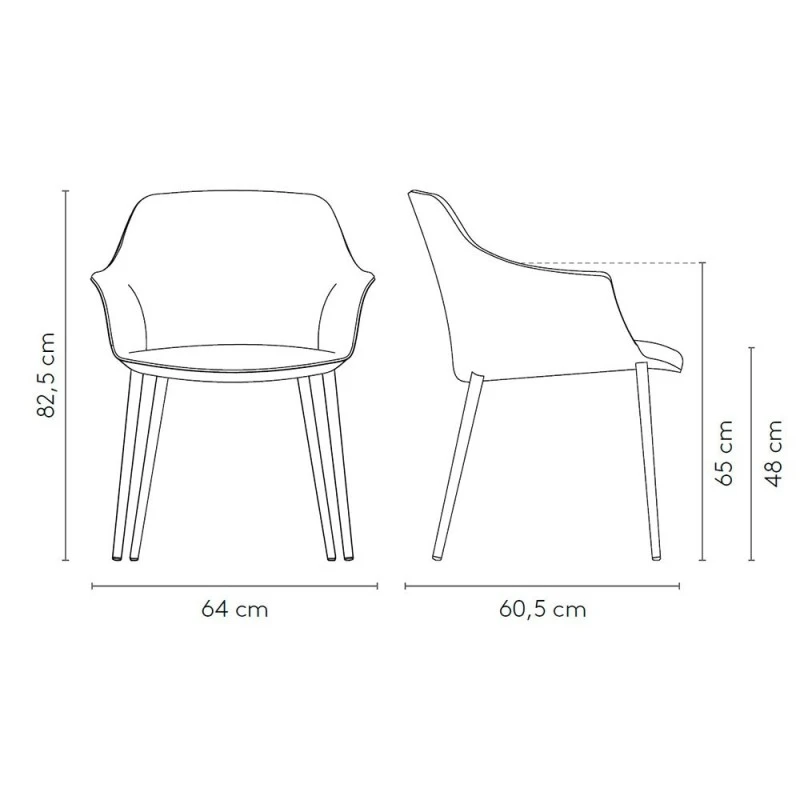 - Ancho: 64 cm | Fondo: 60,5 cm | Alto: 82,5 cm | Altura del asiento: 48 cm | Altura del brazo: 65 cm
