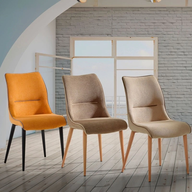 Silla de diseño moderno Bea con patas metálicas en color negro, blanco, cromo brillo o símil roble, tapizada en tela Brido.