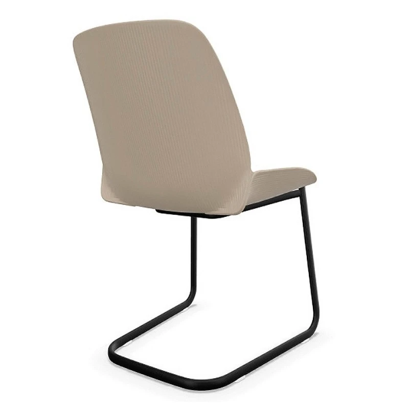 Silla con carcasa de termopolímero Eco disponible en diferentes colores o termopolímero Pure Eco (100% reciclado) disponible en color arena y base cantiléver de pletina ovalada de acero en acabado cromo brillo, blanco o negro. Opción de asiento plafonado o asiento y respaldo plafonados.