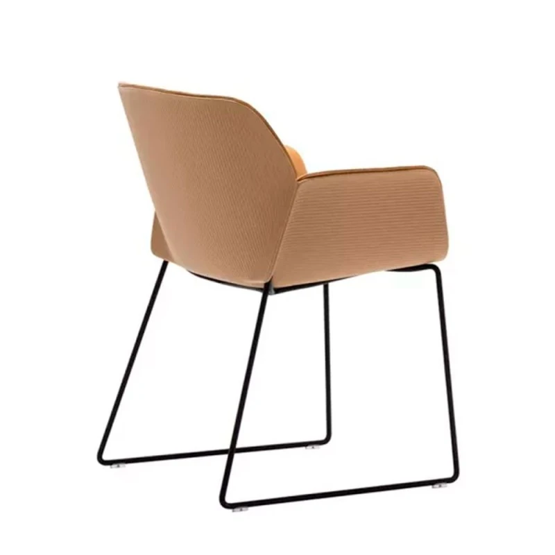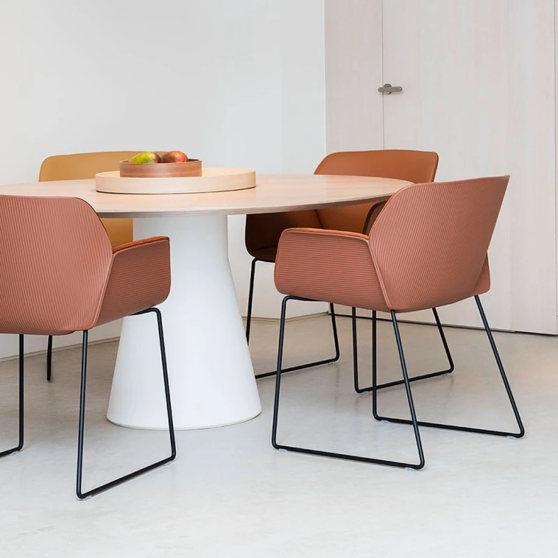 Sillón con carcasa de termopolímero Eco disponible en diferentes colores o termopolímero Pure Eco (100% reciclado) disponible en color arena y base de patín de acero en acabado cromo brillo, blanco o negro. Opción de asiento plafonado o asiento y respaldo plafonado.