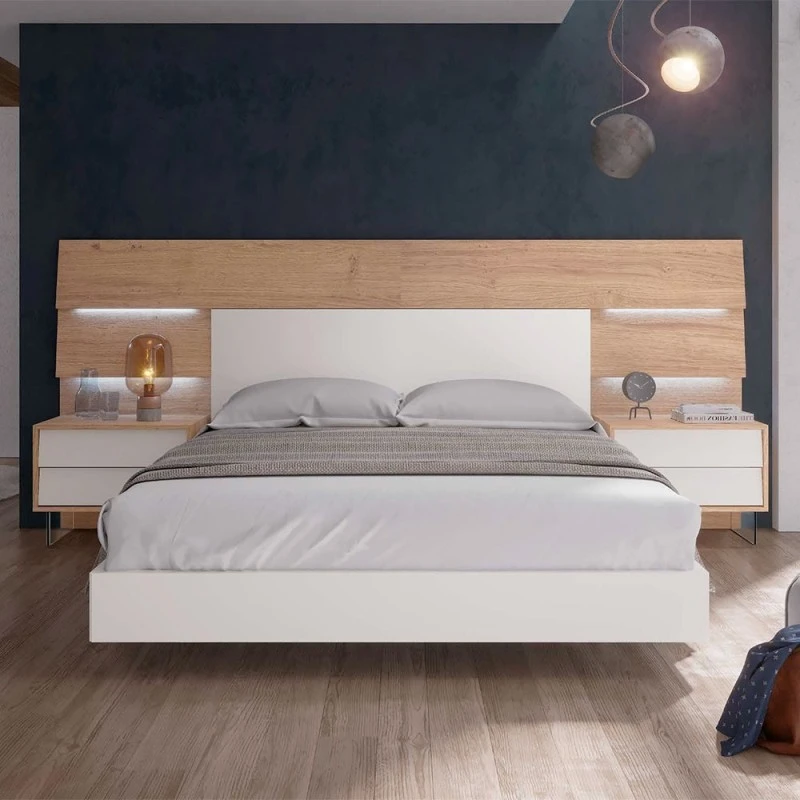 Dormitorio moderno You & Me 01. Formado por Cabecero Shade con luz para somier de 150 cn, bañera Aro 150×190 cm y mesitas de noche con 2 cajones y patas de cristal.