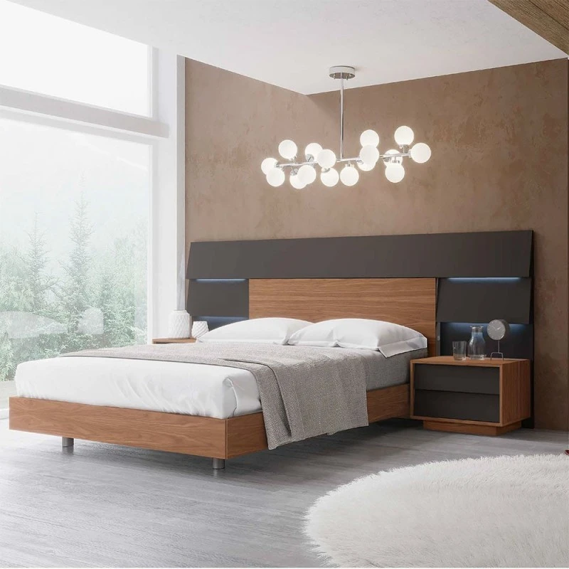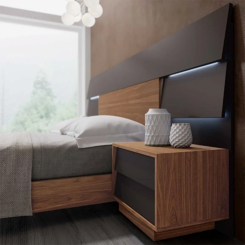 Elegancia y sofisticación en tu dormitorio gracias a su doble iluminación indirecta. Se trata de un dormitorio acabado en Grafito Mate combinado con Nogal Nature.